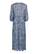 The Moonlight Wave Pin-tuck Dress from Caravan & Co. features a round neck with button keyhole opening, set-in 3/4 length sleeves with an elasticated opening and a 3 tiered slightly-gathered skirt featuring wide pin-tuck pleats, falling to just below the knee. This dress is crafted from a crepe georgette blend in the exclusive Moonlight print design, echoing a modern casual elevated feel.