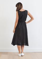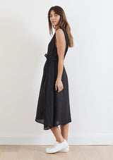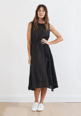 The CP Shades Aria Dress is crafted from 100% Linen. The Aria dress is sleeveless and features a boat neckline, fitted through the bust, soft A-line silhouette, back button detailing and a tie waist.