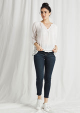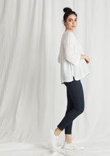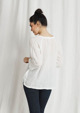 The CP Shades Katie Peasant Top is crafted from 100% Linen. It features a relaxed-box shaped silhouette, non-set in sleeves, ¾ sleeves that buttons up, high-low hemline and a V-neckline.