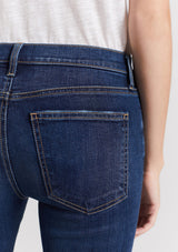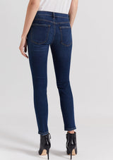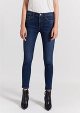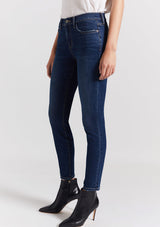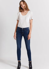 The Current Elliot Stiletto Jean features in a mid-dark blue wash with slight fading on the waist, hips & thighs, belt loops, zip & button-up closure, front and rear pockets, and a tailored slim leg that finishes off at the ankle in a light stretch dark denim.