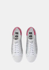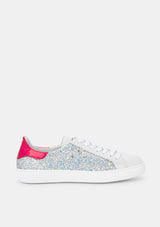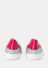 The Irresdecent Glitter Indiana Sneaker from DOF is crafted from leather and glitter sides, a red heel detail, and fresh white suede tongue.