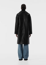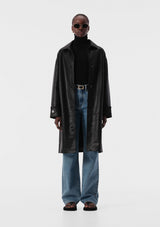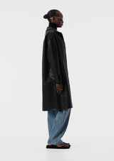The Amenta Coat from Elka Collective features a classic collar, button front, full sleeve with button cuff, front pockets and seam detail to create an easy off-duty look. Crafted from signature vegan leather, this coat falls to mid-length and embodies a sleek, utilitarian design.