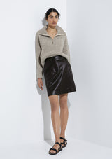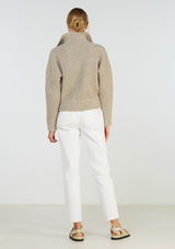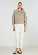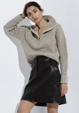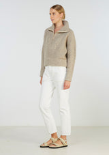 The Covey knit is a chunky wool nylon blend knit featuring a high zip neck, dropped shoulders and deep rib hem. Pairs classically with jeans and a white ribbed tank.