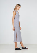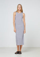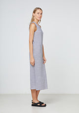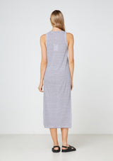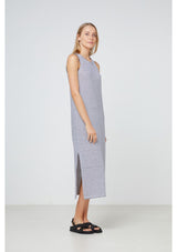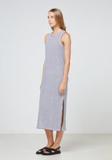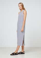 The EC Linen Tank Dress from Elka Collective is a classic sleeveless, crew neck tank dress made from premium 100% linen jersey in a navy stripe. It features a self bind neck and armhole with side splits at the hem.