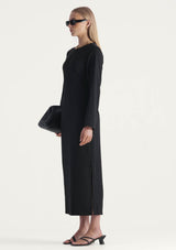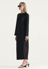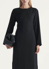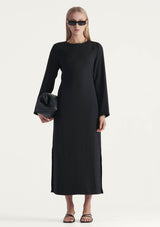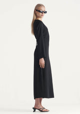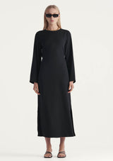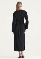 The Elisabetta Dress from Elka Collective features a crew neckline, long sleeves, side splits at hem and a relaxed silhouette that can be cinched at the waist via the criss-cross tie back detailing. Cut from a smoothing black fabrication with soft drape, this midi-length dress is a timelessly elegant silhouette and a simple outfit solution for the cooler months.