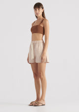 The Gillian Short from Elka Collective is the perfect weekender style. Crafted in a lightweight linen lyocell blend, featuring blush and tan stripe, elasticated waist with tie and hip pockets.