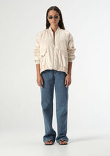 The Haru Bomber Jacket from Elka Collective is a classic bomber style made for elevating your casual outfitting. Crafted from a lightweight fabrication with a high sheen texture, this jacket has an oversized, boxy silhouette that allows comfort and versatility for layering. It boasts classic bomber details such as ribbed collar and cuffs, drop shoulders, full-length sleeves with zip detail and a zip front opening. Large patch pockets add functionality while the elasticated hem with side zip openings allows for an adjustable fit. Embrace a touch of masculine style with the Haru Bomber Jacket, perfect for effortlessly throwing on over jeans and basic tees for a polished yet relaxed look.