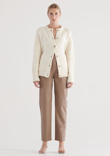 The Hepworth Knit Cardi from Elka Collective is crafted from a cotton wool blend for a soft, cosy hand-feel. It’s cut in a slightly oversize shape with crew neck, dropped sleeves, hip pockets and a button-down front.