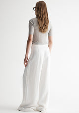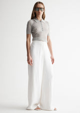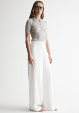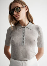 A transeasonal piece for work to dinner outfitting, this polo-style top is made of a semi-sheer cotton blend knit fabric with fine rib texture. Cut to a fitted silhouette with neat collar, half button front, and short sleeves, this top has stretch throughout for a comfortable fit.