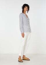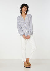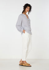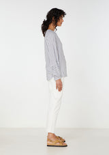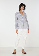 The Elka Collective Leila Shirt features a a soft v neck, button through front and bell sleeve with contrasting stripe. Crafted from 100% Viscose.
