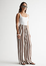 Made from a soft rayon fabric with bold stripe pattern, these pants are ideal for relaxed weekend styling with core basics and relaxed fit tees. These pants are cut to a mid-rise waist with a full-length wide leg, elastic waistband and drawstring tie