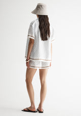 The Lumi Shirt features a classic shirt silhouette and all-over monogram print, giving this piece a unique look. Made of a soft, silky fabric blend, this shirt has a collared neckline, short sleeves, and button through front with contrast stripe and piping detail.