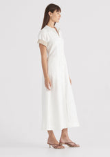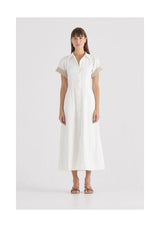 The Luminary Dress from Elka Collective is a short sleeved, A-line dress with a cinched waist, button-down front into a full skirt. Featuring contrast cuffed sleeve, elasticated back waistband and traditional shirt collar. This dress is made from 100% linen.