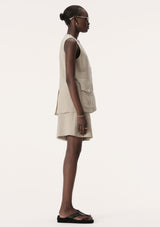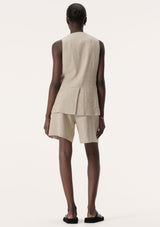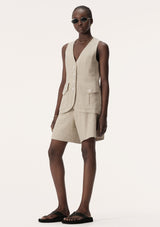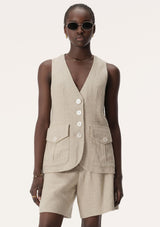 The Maja Vest from Elka Collective features a traditional sleeveless cut with v-neckline, shell button front, front patch pockets and back vent. This vest takes classically masculine tailoring and elevates it to a uniquely feminine style. Crafted, from a viscose and linen blend, Maja promises to be a key layering piece for in between weather and can be layered over shirts or styled alone.