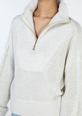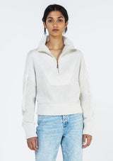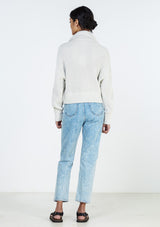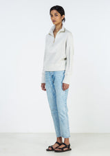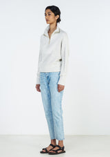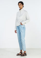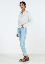 The Mercer knit is woven in a super soft 100% cotton yarn featuring a high zip neck, dropped shoulders and deep rib hem. Pairs classically with jeans and a white ribbed tank.
