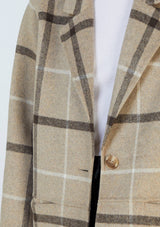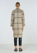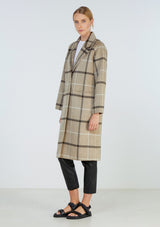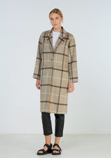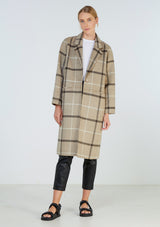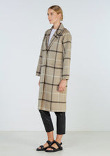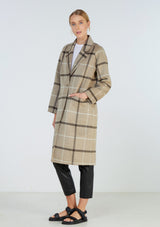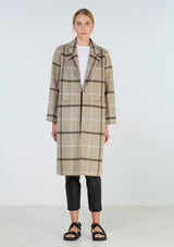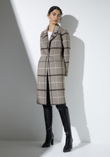 The Mica coat is a statement Autumn piece constructed from a beautiful soft wool blend in a cocoa check. It features collared neck, patch pockets and self fabric removable waist tie.