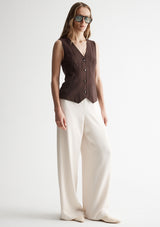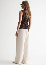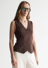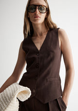 The Nina Vest from Elka Collective is designed in a tailored silhouette and features a traditional sleeveless cut with v-neckline, shell buttons, front welt pockets and a back strap with adjuster to cinch in the waist. Crafted from a twill-weave acetate fabrication, this vest can be styled alone or layered over thin knitwear, shirts and basic tees.