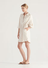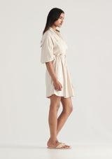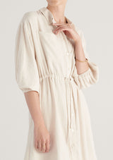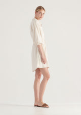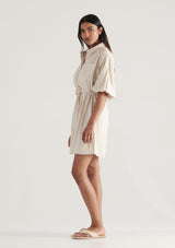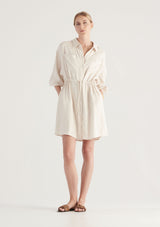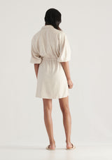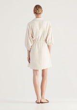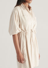 The Palmer Dress is by Elka Collective is crafted from a premium linen viscose blend for a textured feel with soft drape. This slightly oversized fit dress features an open collar, double patch chest pockets, puff sleeves with elasticised cuff, drawstring waist and a mid-thigh skirt.