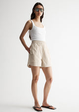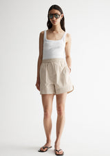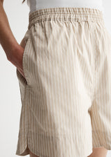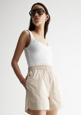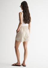 The Poppy Short from Elka Collective features an elasticised waist, side pockets and a back pocket  with the signature Elka embroidered monogram. Crafted from a stretch cotton blend, this fully lined, striped short is a timeless addition to any wardrobe. Wear it alone or with the matching Poppy shirt for a polished ensemble.