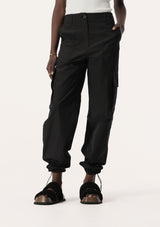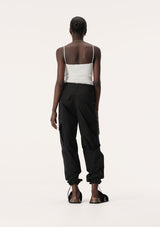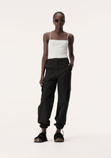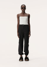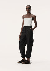 The Tamsyn Cargo Pant by Elka Collective features a classic zip and button fly, cutaway, side, and back pockets and a straight leg in a classic militaristic cargo styling. The elasticated ankles can be adjusted using a drawstring, giving freedom to create your perfect look. Crafted from a silky-look nylon fabric with cotton lining in the pocket interiors, this relaxed pant is a lightweight option for warmer weather.