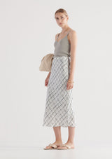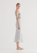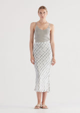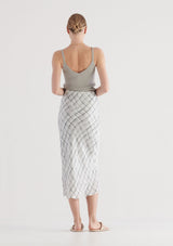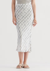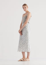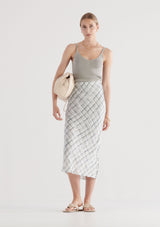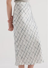 The Tasman Slip Skirt by Elka Collective is printed on a silk blend satin with custom designed sage check yardage. This piece features an elastic waist, bias- cut skirt and is fully lined for coverage.