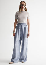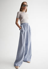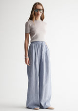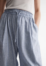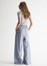 The Venice Pant is made from a soft linen blend fabric with a pinstripe pattern. These pants are cut to a mid-rise waist with a full-length wide leg, elastic waistband and drawstring tie.