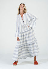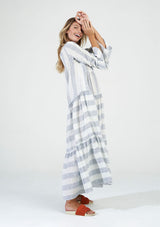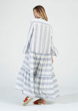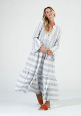 Sweet and playful, the Sorrento Dress is a maxi length dress featuring a tiered skirt and a flared sleeve for a modern bohemian look. The signature Sea Stripe is a fresh integrated stripe of Blue and White.