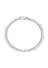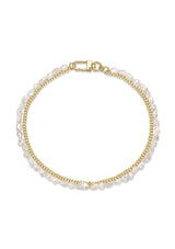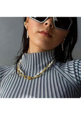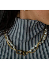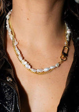 The Janet Pearl + Chain Statement Necklace, features intertwined freshwater baroque pearls with statement chain and lock branded with F+H logo.
