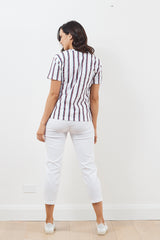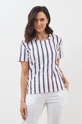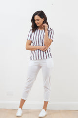 We’ve all fallen in love with shape of the Mela Purdie Bermuda T, so here is it in this season must have Federal Stripe print! This functional design continues to offer classic styling but with an elevated look from the print design.