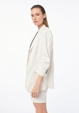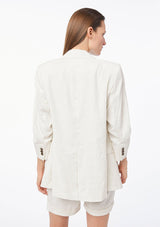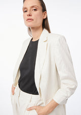 The Pleated Boyfriend Blazer from FRAME features a lightweight pinstripe blazer that is defined by clean lines and modern pleats along the sleeves. Crafted from a Linen blend.