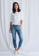 The Le Garçon Crop Jean from FRAME are designed to sit at the hips and taper into a cuff that hits above the ankle. Further details include a medium wash with navy stitching, zip/button closure, belt loops and 5 pockets.