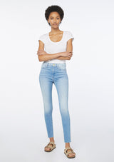 The FRAME Le High Skinny Raw Edge Jeans are a classic high-rise skinny jean with a modern feel. Designed to sit at the small of the waist with a form-fitting shape, this light-blue wash features raw hems and slight fading.