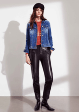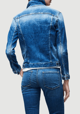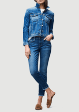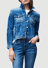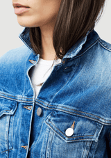 Le Vintage Jacket from Frame features a soft stretch denim and a gently worn fade give a well-loved look to a classic silhouette. Button front, patch pockets, brushed metal hardware, slim fit.