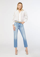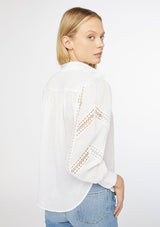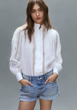 The FRAME Panel Lace Button Up Blouse features a relaxed fit design with collar, button front, voluminous sleeves and lace panel details on the sleeves and front. Crafted from a rigid denim-cotton.