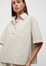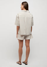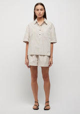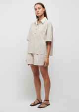 The Alessandro Striped Cropped Shirt from Friend of Audrey features a shirt collar finished with contrasting button detailing, a front pocket and cuffed sleeve finish. This crisp cropped shirt is crafted in a cotton poplin fabrication printed with the season’s signature neutral stripe. Complete the look with the Riviera Striped Shorts.