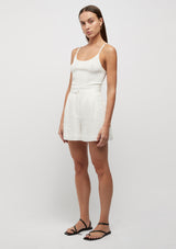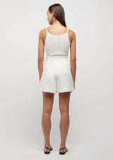 The Hayworth Blanket Stitch Short from Friend of Audrey features side pockets finished with subtle blanket stitch detailing, a front clasp and zip closure and front pleats for a sleek, tailored approach to a relaxed summer short. This tailored short is cut from a medium weight 100% linen fabrication.
