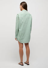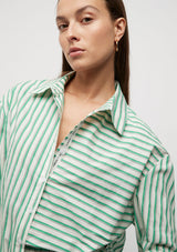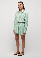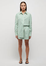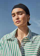 The Riviera Striped Shirt from Friend of Audrey features a shirt collar finished with contrasting button detailing, a full-length cuffed sleeve finish and the signature Friend of Audrey printed bias on the opening seam. This bright summer shirt is crafted in a crisp Cotton poplin fabrication printed in the season’s signature green stripe. Complete the look with the Riviera Striped Shorts.