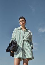 The Riviera Striped Short from Friend of Audrey features an elastic waistband, side pockets and side split seams with a curved finish. This relaxed summer short is cut from crisp 100% cotton poplin fabrication, printed in this season’s signature neutral stripe. Wear with the Alessandro Striped Cropped Shirt.