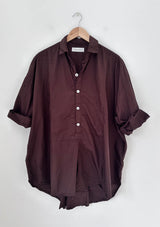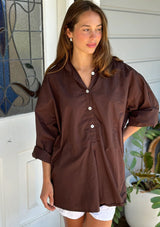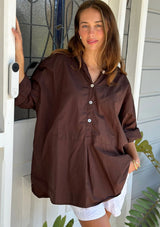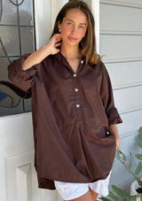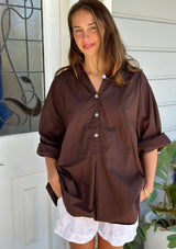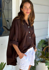 The Megan Shirt from frockk features a button opening with front panel detail, long sleeves that can be worn rolled up and an oversized silhouette which falls lower at the back hem. This shirt is crafted from 100% washed linen; a non-stretch fabrication that is breathable and ideal for everyday wear.