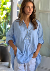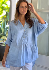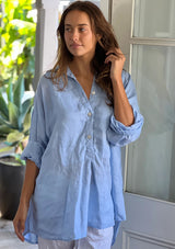 The Megan Shirt from frockk features a button opening with front panel detail, long sleeves that can be worn rolled up and an oversized silhouette which falls lower at the back hem. This shirt is crafted from 100% washed linen; a non-stretch fabrication that is breathable and ideal for everyday wear.