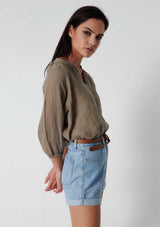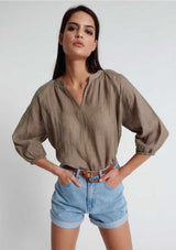 The Biarritz Blouse from IN THE SAC features a relaxed silhouette with V-neckline and 3/4 length sleeves softly elasticated at the elbow to create a subtle balloon shape. Soft gathers at the centre back provide for comfort and movement. Woven from the world’s oldest luxury fibre, 100% all-natural linen, grown in the Netherlands and woven exclusively for IN THE SAC. A result that is perfectly weighted, beautiful quality and luxuriously soft.