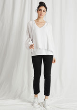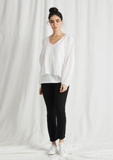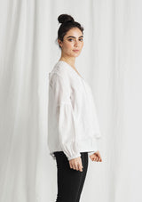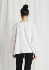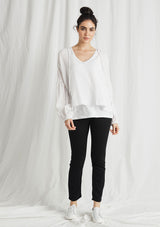 The Khlassik Peasant Blouse is crafted from 100% Cotton. This Blouse features a V-neckline with tie detail, drop shoulder, peasant sleeve and raw hemline finish.