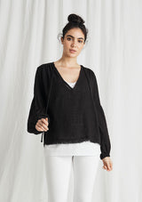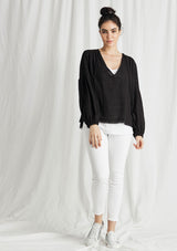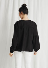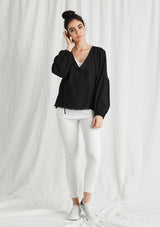 The Khlassik Peasant Blouse is crafted from 100% Cotton. This Blouse features a V-neckline with tie detail, drop shoulder, peasant sleeve and raw hemline finish.