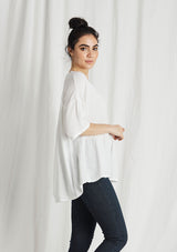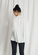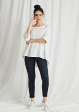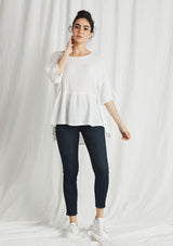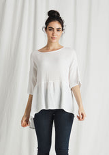 The Khlassik Balmy Frill Front Top is crafted from 100% Linen. This Top has a relaxed silhouette with a soft peplum design on the bottom. It also features a ¾ sleeve and a round neckline.