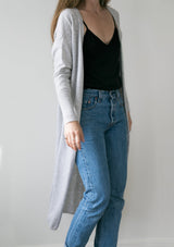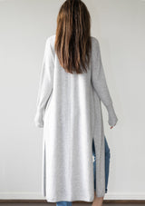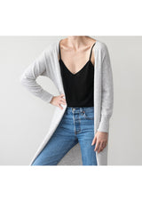 The Khlassik Luxe Longline Cardigan is crafted from 100% Cashmere. This Cardigan features a rounded collar, non set-in-shoulder seam, side splits and long sleeves with high ribbed detailing at the cuff. This Cardigan falls to mid calf length.