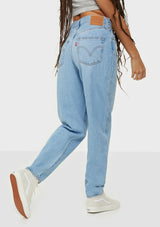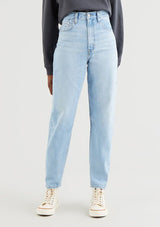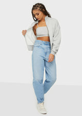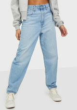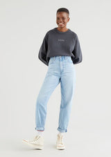 This jean features a flattering high rise and stacked, tapered leg. It's designed to be worn as a relaxed, loose style.