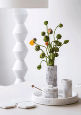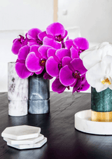 The Marble Basics Basic Hexagonal Coasters make the perfect complement to any table setting. Keep these stacked on a coffee or side table ready to lay out for entertaining guests as they simultaneously create a beautiful little sculpture amidst your decorating. You can place one in the bathroom for resting your jewels, or hand soap or a bar of soap. These are handmade products and Marble is a natural material, so every product differs slightly in size and colour to those visible in the store. All of our Marble Basics pieces are original with different veining and patterning which makes each piece uniquely beautiful. Stone is a natural product and may contain fissures, cracks, holes and pits. No two pieces of natural stone are alike, please be aware that cream tones may be present as well as browning, yellowing and spots.