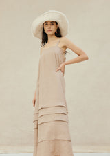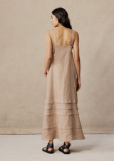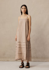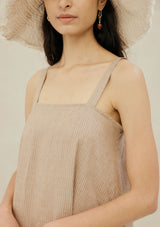 The Angela Dress from New Zealand designer, Marle is a relaxed silhouette featuring an elegant square neckline with thick straps that are secured by wooden buttons at the back which can be adjusted for the perfect fit. This dress falls to the ankle with a subtle A-line silhouette finished with four folded pleats at the bottom. Crafted in a finely woven linen that features an oat base and thin light pink diagonal stripe.