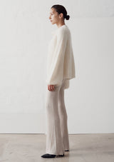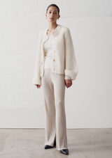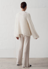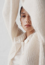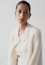 The Cait Cardigan is crafted in a mohair / wool yarn, using a fisherman rib stitch. It features the same oversized balloon sleeves, with a slight A-line fit through the body. It has a high rib neck and rib cuff sleeves and is finished off with five oversized shell buttons down the centre front.