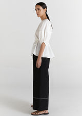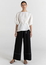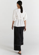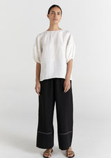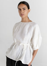 The Cooper Top by Marle is a best seller and this version is crafted in our signature flax linen. It has a round neckline and elbow length balloon sleeves, with a relaxed fit through the body. This top also has a matching, detachable tie that can be used to cinch in the waist.